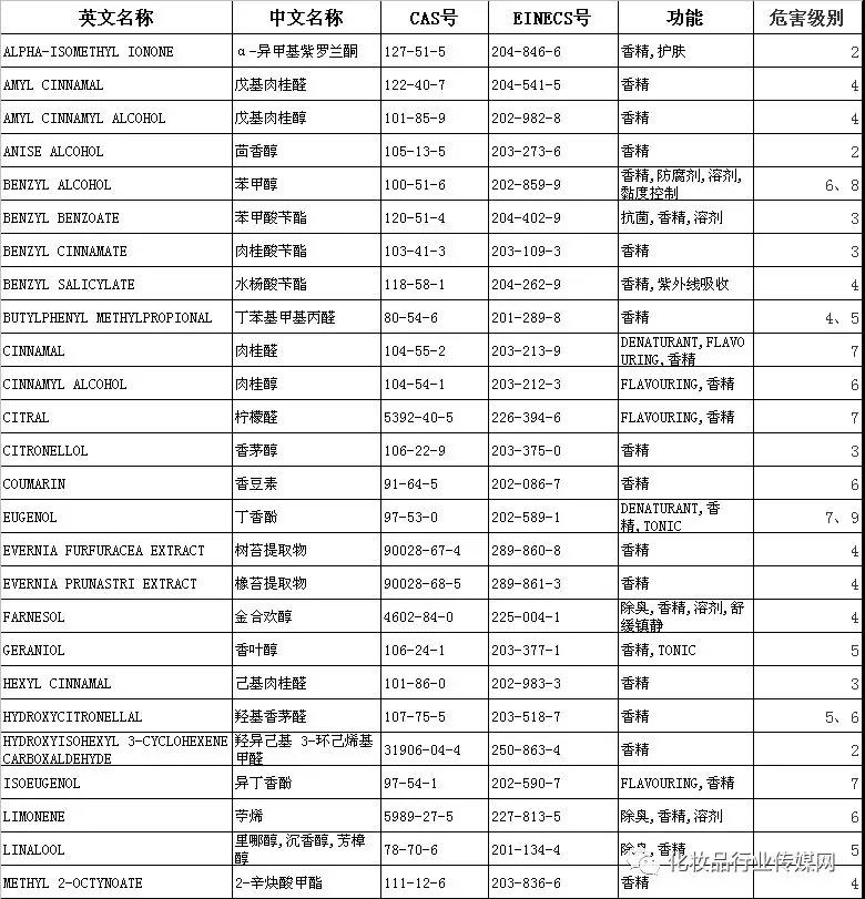 歐盟化妝品指令(76/768/EEC)第七修正案規(guī)定:自2005年3月起,這些成分在不可沖洗型化妝品中含量大于等于0.001%;在可沖洗型化妝品中含量大于等于0.01%時(shí),化妝品香料中26種致敏原物質(zhì)必須在化妝品標(biāo)簽上予以標(biāo)注。