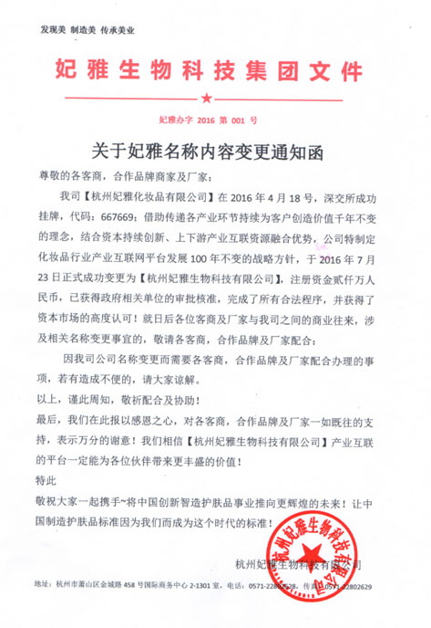 2016年4月18日,杭州妃雅生物科技有限公司(掛牌代碼:667669)成功登陸資本市場,按上市要求,同步完成公司治理結(jié)構(gòu),完善了頂層設(shè)計,正式于7月23日成功完成公司名稱變更。