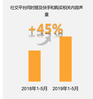 數(shù)據(jù)顯示,2019年1~5月,社交平臺(tái)同時(shí)提及快手和購(gòu)買相關(guān)內(nèi)容聲量同比增長(zhǎng)45%,快手已成為網(wǎng)民“種草”、“剁手”的主要平臺(tái)。