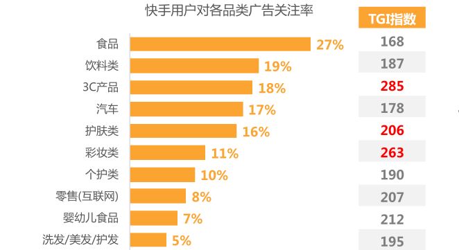 隨著“老鐵經(jīng)濟(jì)”和“內(nèi)容帶貨”越來(lái)越“熱”,美妝產(chǎn)品也在快手短視頻中博得較高關(guān)注度。調(diào)查顯示,快手用戶對(duì)美妝產(chǎn)品類廣告關(guān)注度達(dá)11%,美妝類廣告TGI指數(shù)高達(dá)263。