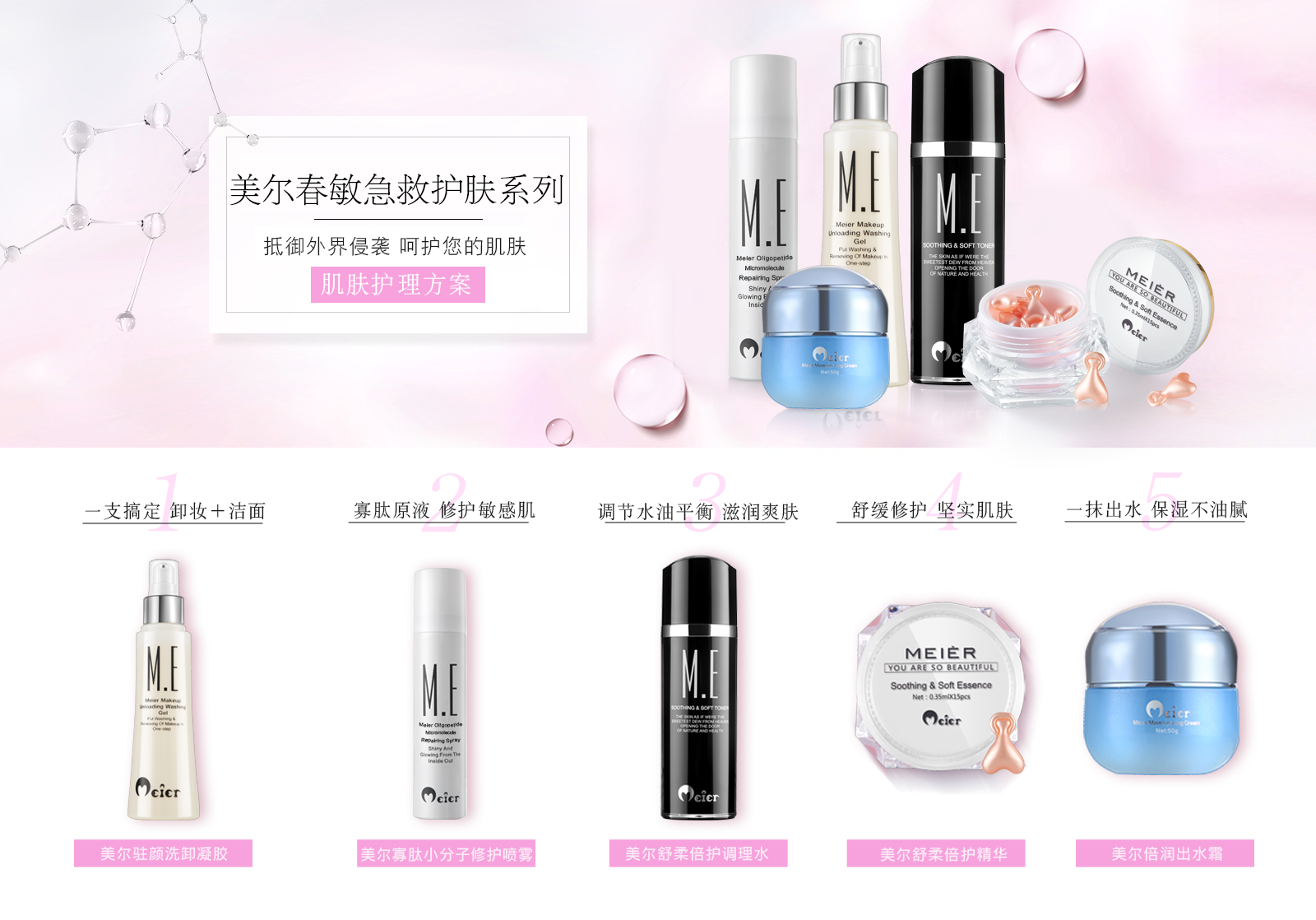 駐顏洗卸凝膠(溫和清潔的同時(shí)補(bǔ)水保濕)——寡肽小分子噴霧(從根本修復(fù)肌膚問題及時(shí)補(bǔ)水)——調(diào)理水(修復(fù)肌膚屏障精準(zhǔn)調(diào)節(jié)調(diào)理肌膚)——小愛心(舒緩修護(hù)堅(jiān)實(shí)肌膚)——出水霜(補(bǔ)水鎖水深度滋養(yǎng))